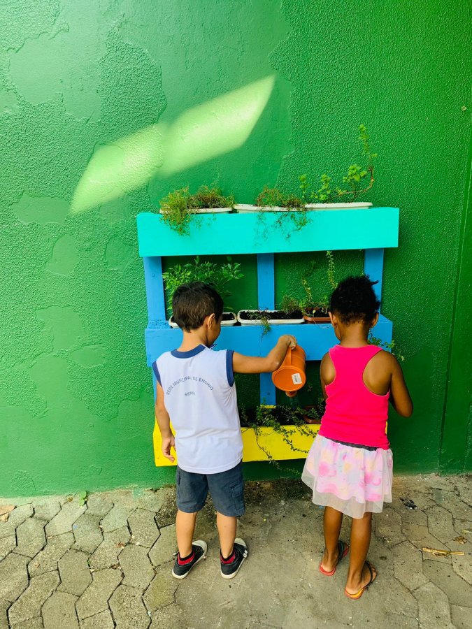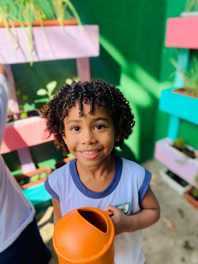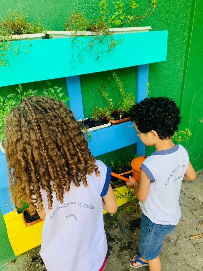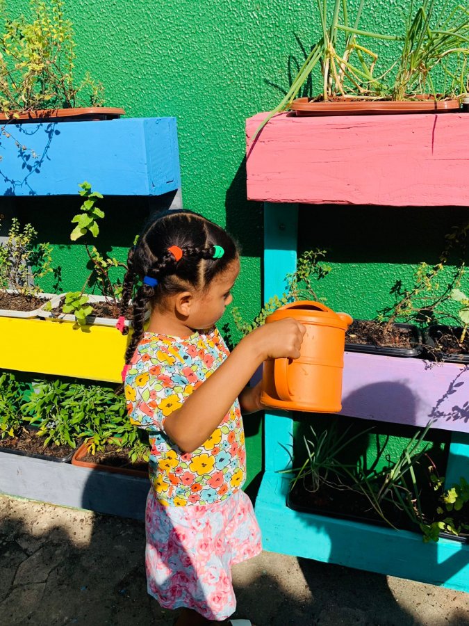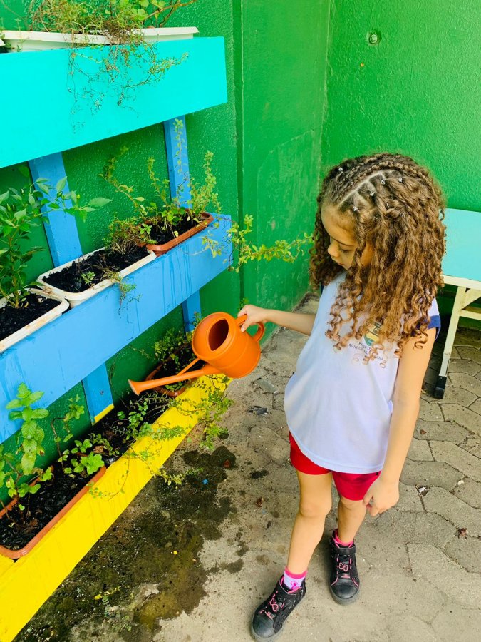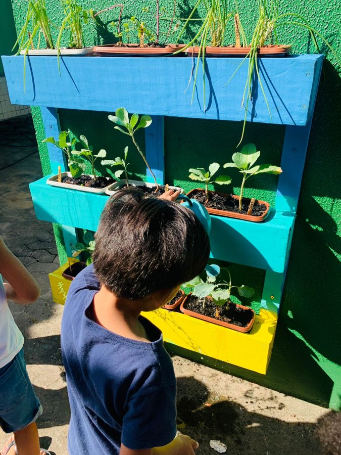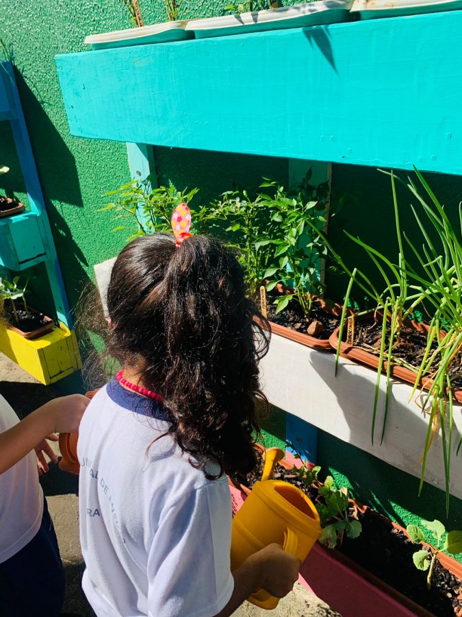 E as turmas de 3 a 5 anos estão com uma agenda matutina e vespertina para MOLHAR a horta.